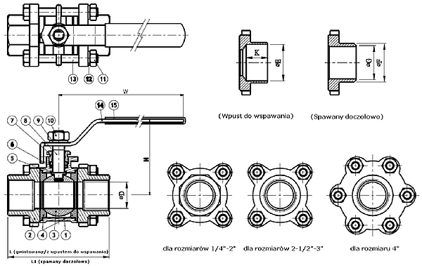 1. Zawór kulowy 3-częściowy dostępny także w wersji z przyłączami do wspawania i w wersji gwintowanej.